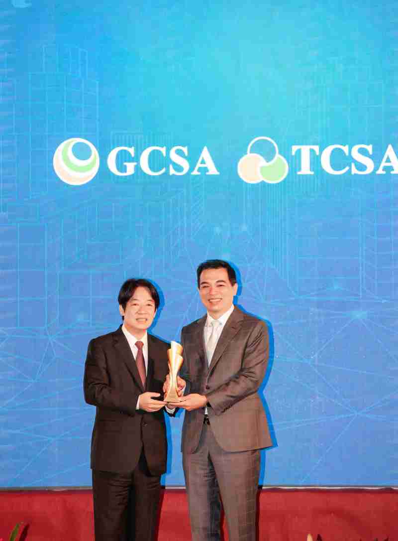 达全方位永续表现获全球永续奖及台湾永续奖肯定,,,由副总统赖清德颁奖 (左),,,尊龙z6总经理柯富仁 (右) 代表领奖