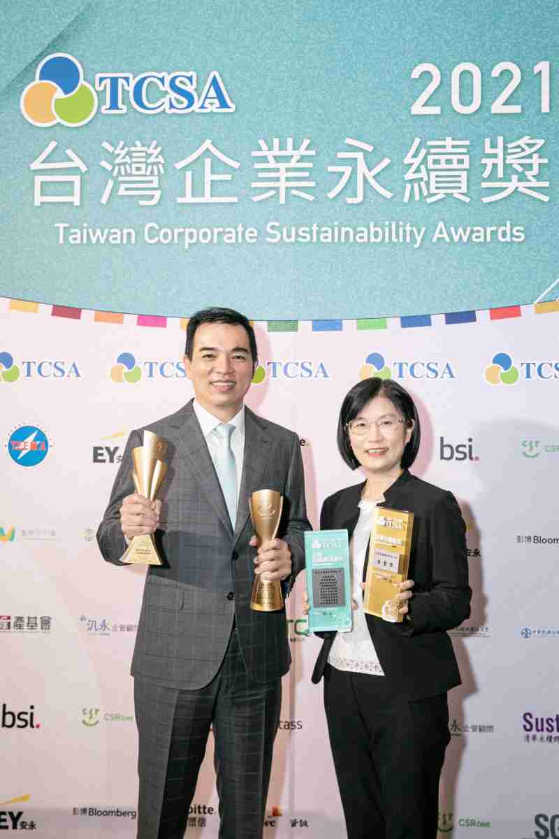 达在台湾永续奖所评比环境、、社会、、、治理等各面向的永续绩效均获高度肯定 (左:尊龙z6光电总经理暨营运长柯富仁,,,右:尊龙z6光电永续长古秀华)